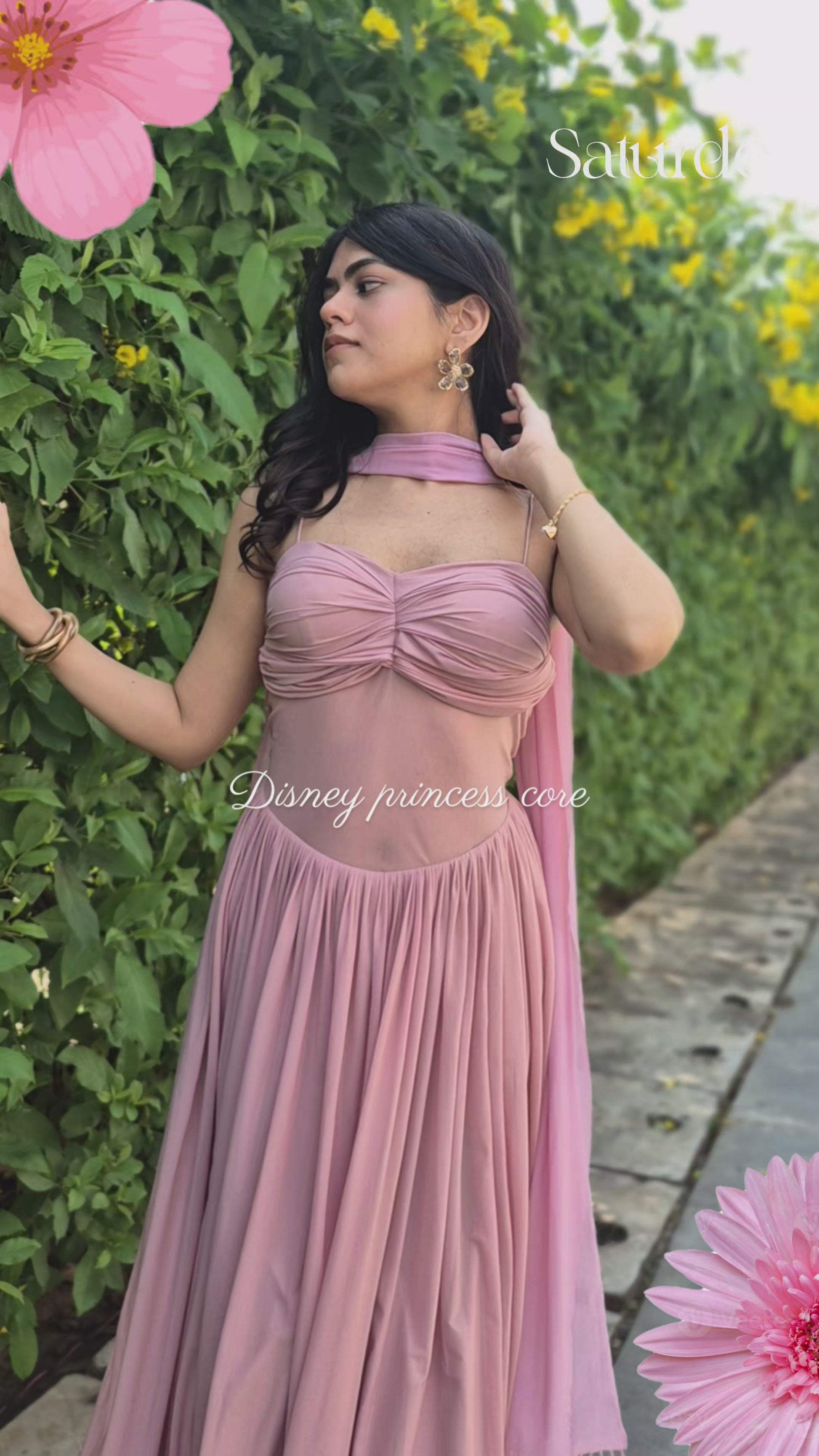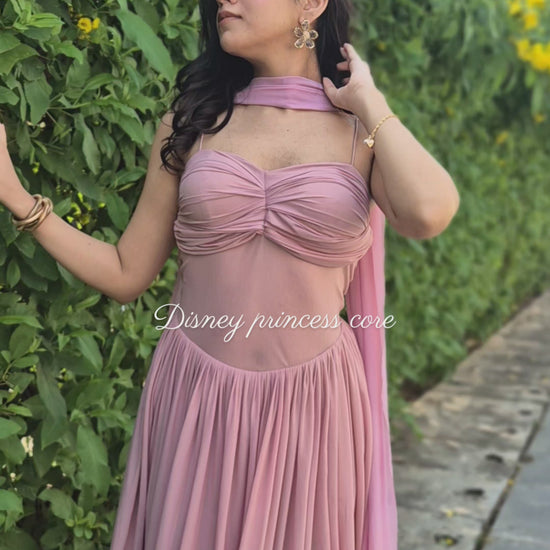 Bridgerton, but make it Indian. A stunning pink gown with a corset-style back, paired with a dainty dupatta with tassels.