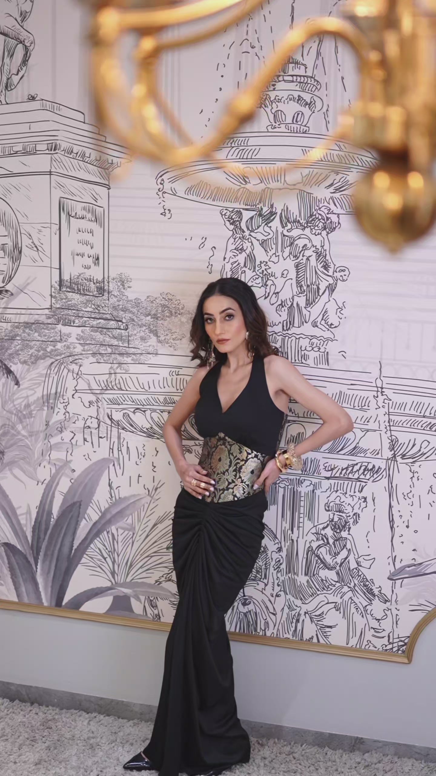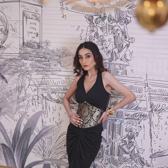 Sculpted to perfection, this corset comes with boning for structure, a sleek halter neck with integrated cups for support, and complete double-lining for comfort.